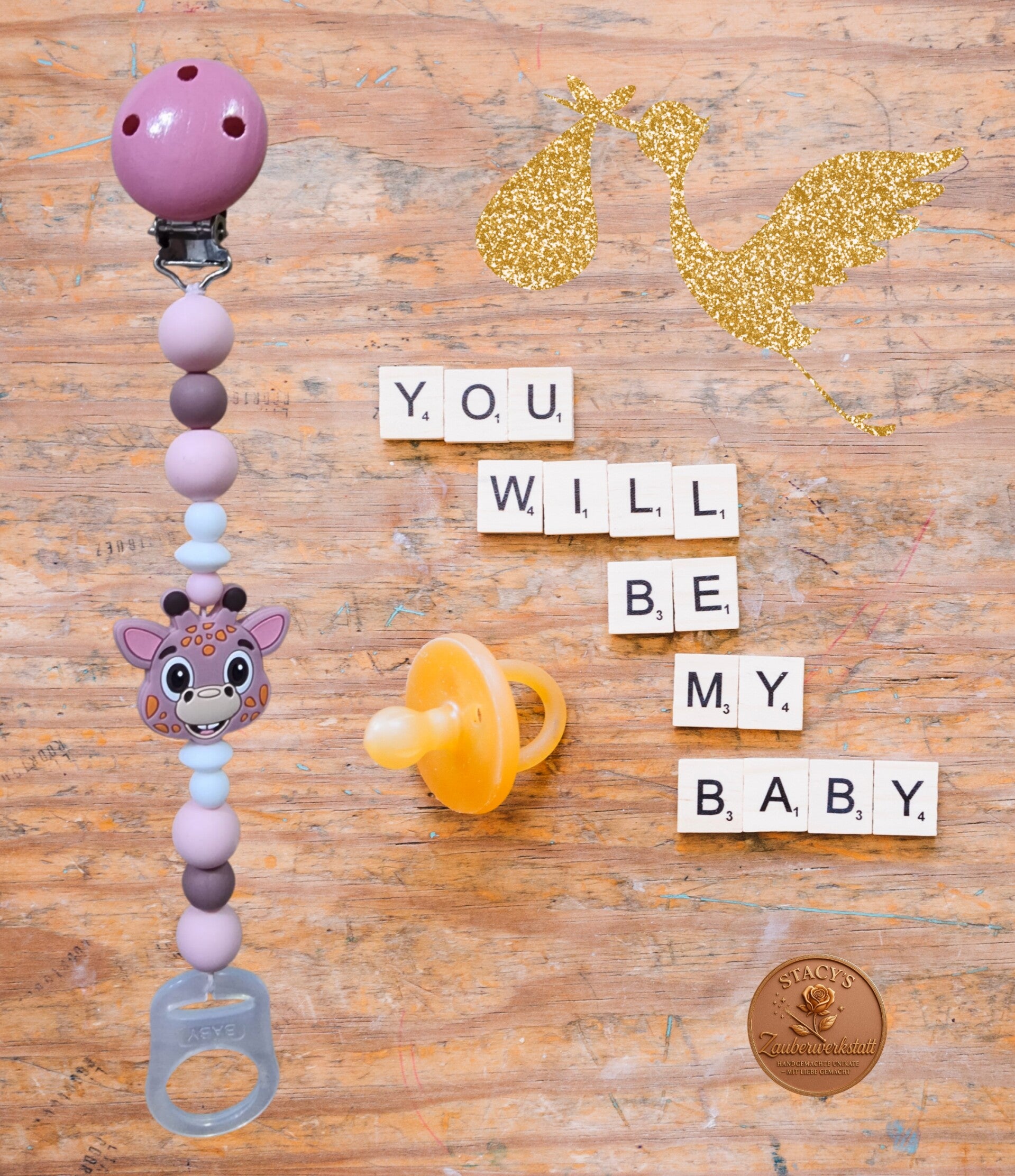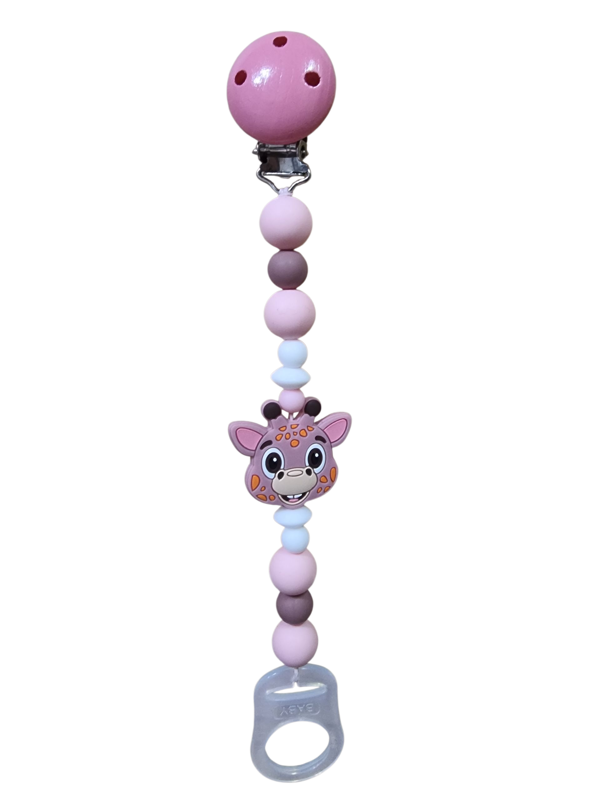 Zarte Schnullerkette 25 cm in Rosa mit liebevollen Details: Aus weichen Silikonperlen, süßer Giraffe aus Silikon und einem sicheren Clip aus Holz. Der Schnuller lässt sich dank des praktischen Silikonverschlusses kinderleicht befestigen. Perfekt für unterwegs – hübsch, funktional und 100 % babygeeignet.