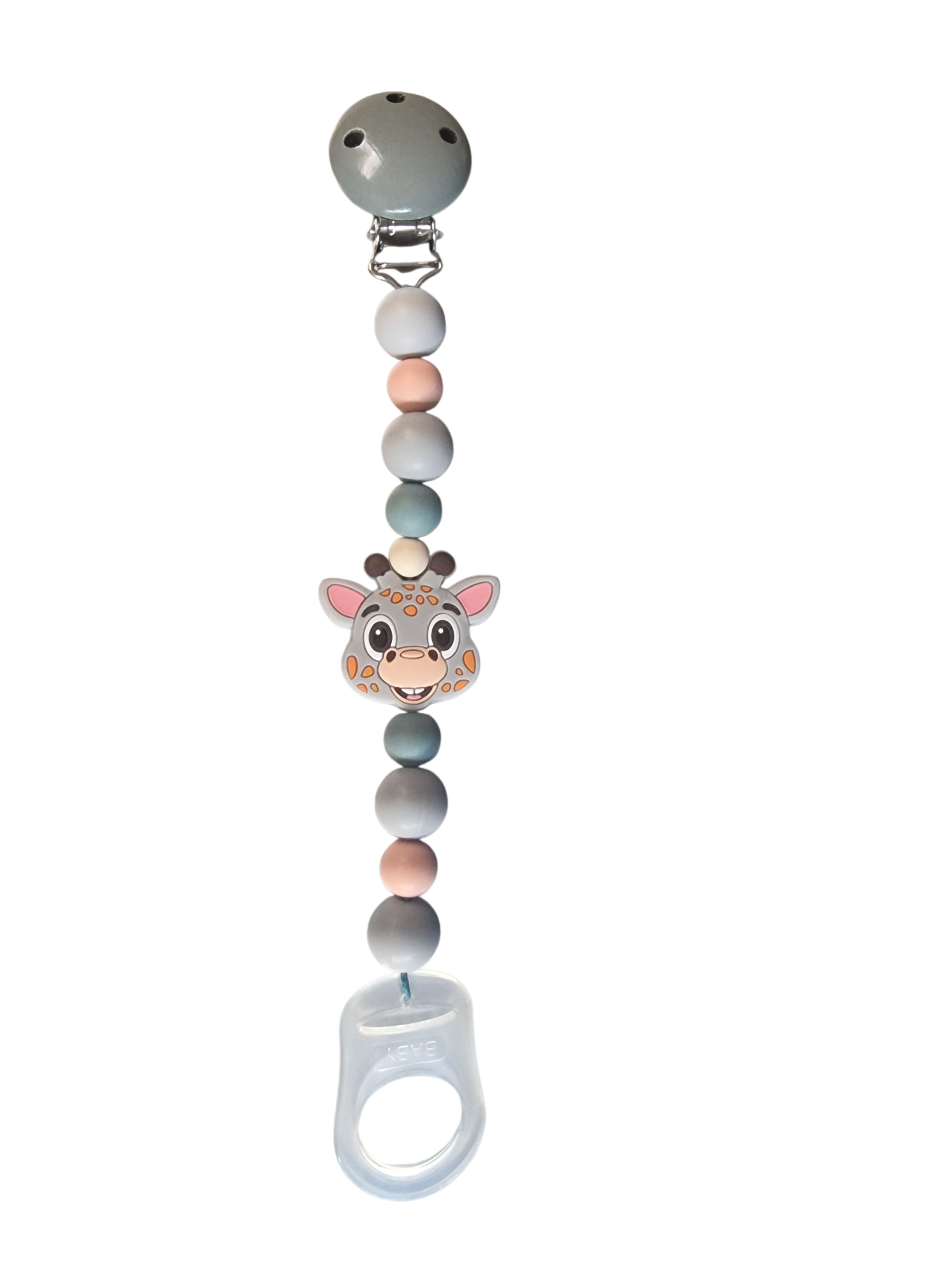 Aus weichen Silikonperlen, Silikon Giraffe und einem sicheren Holz Clip in Grau. Der Schnuller lässt sich dank des praktischen Silikonverschlusses kinderleicht befestigen. Perfekt für unterwegs – hübsch, funktional und 100 % babygeeignet.