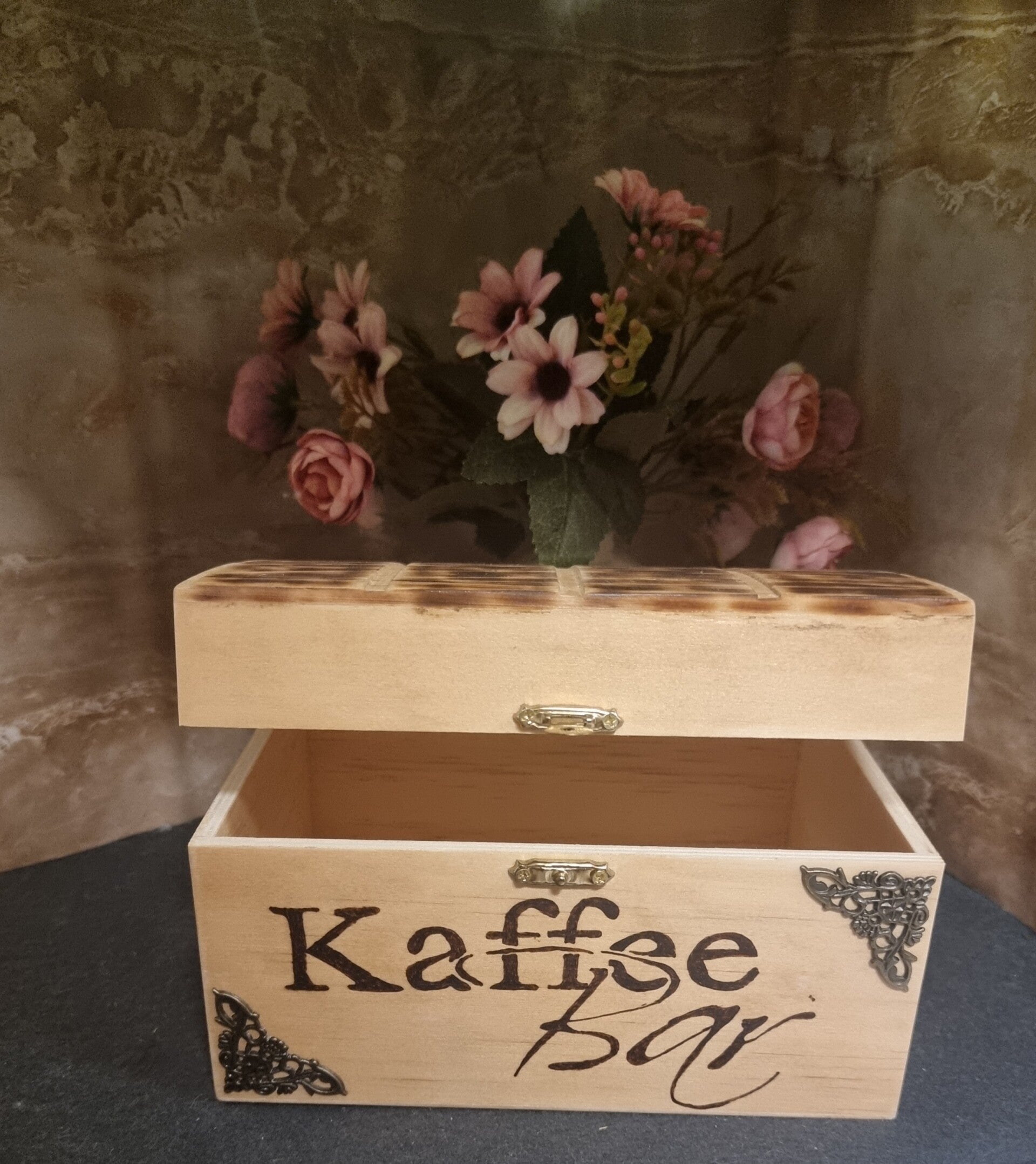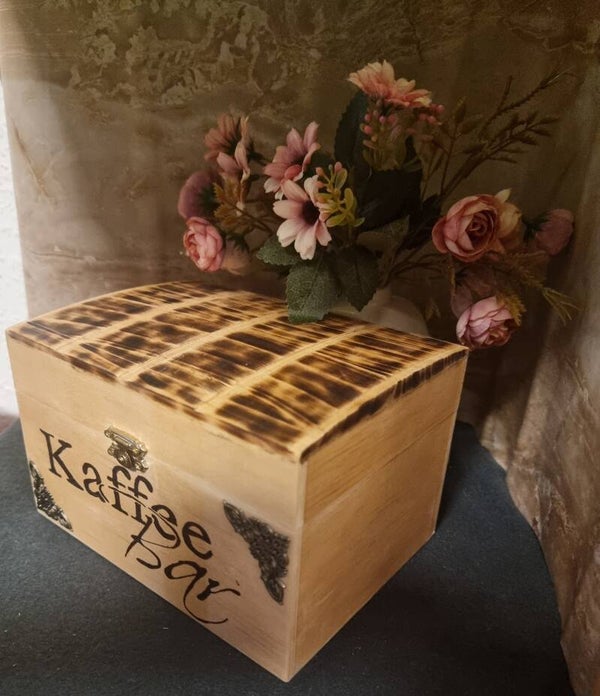 Diese tolle Holzbox ist Mal eine Abwechslung zu den normalen Kaffeeboxen. Sie wurde auf der Vorderseite mit zwei schönen Ornamenten versehen. Sie wurde gebeizt und lackiert so das sie auch Mal leicht feucht ausgewischt werden kann.