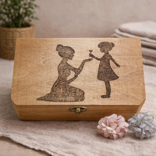 Diese Holzbox wird mit feiner Brandmalerei von Hand gestaltet und ist ein besonderer Ort für Schmuck, kleine Schätze oder persönliche Andeken.